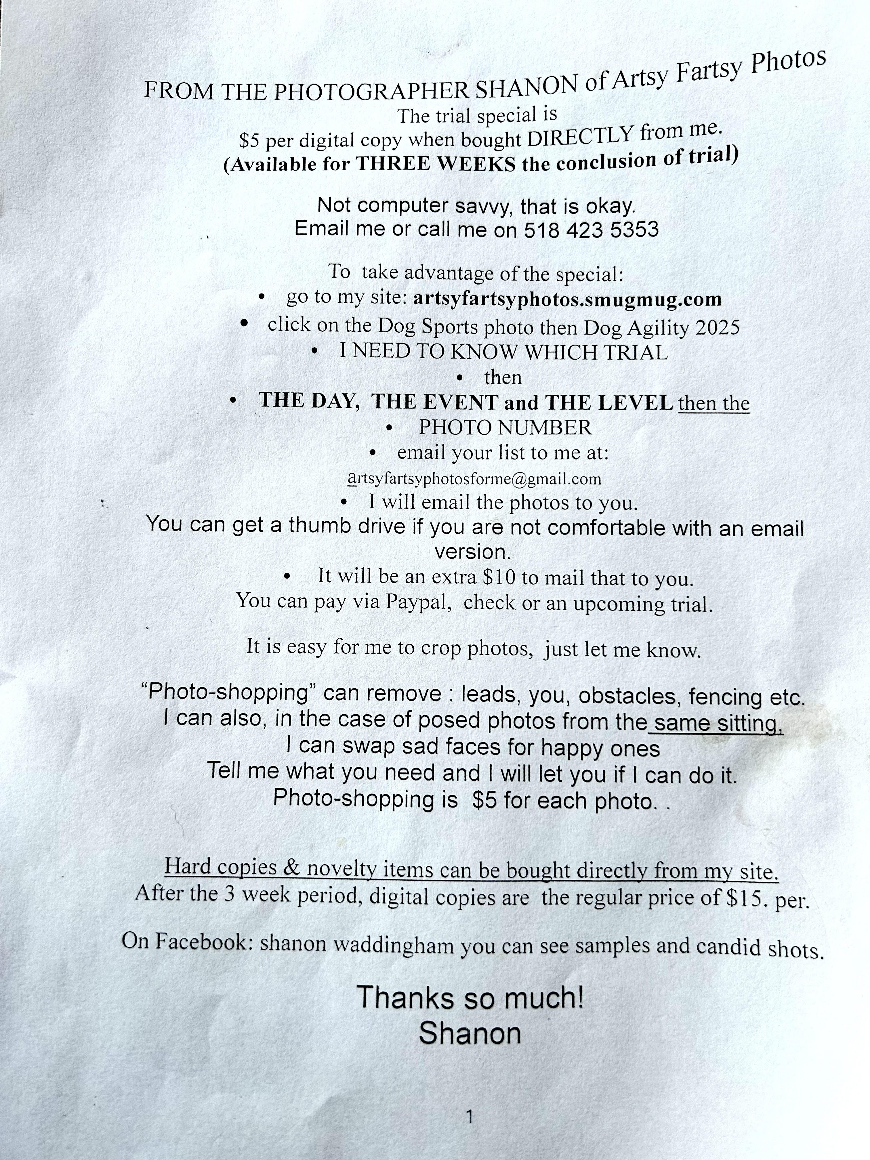 Fees: 1-9 runs $20, 10+ runs $19 (same dog), Day of Show Add $5